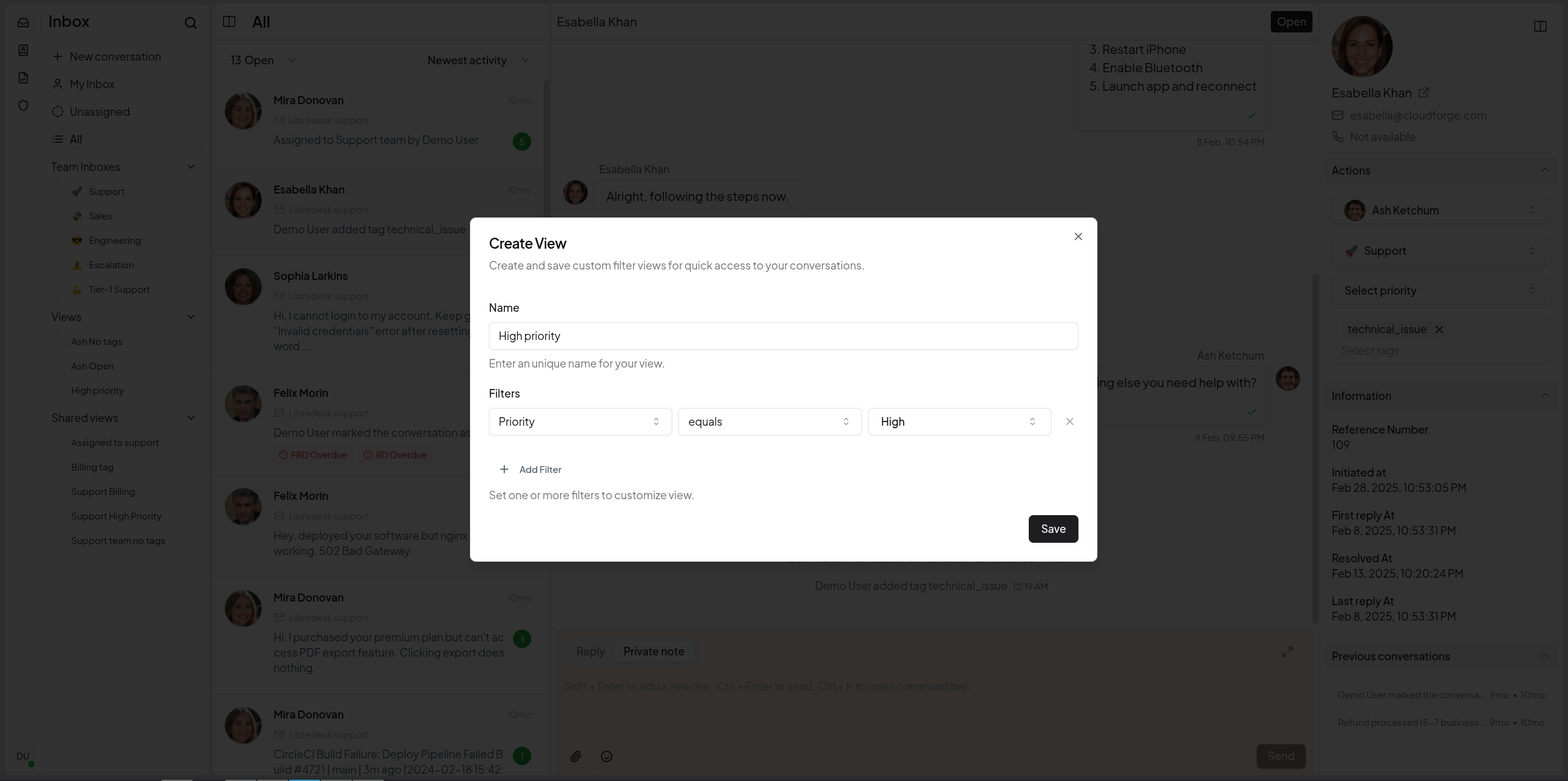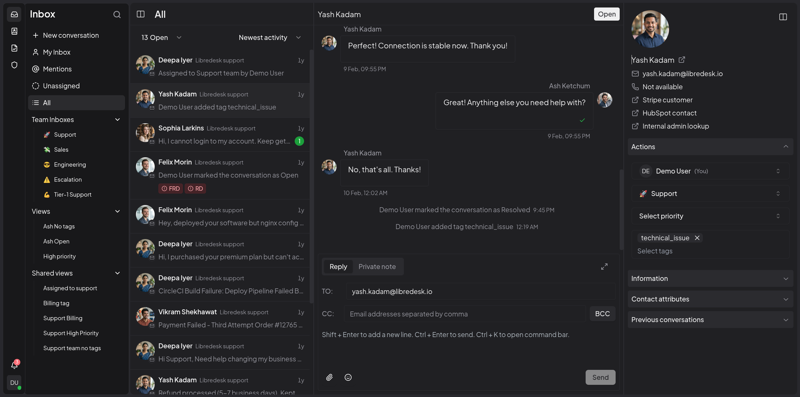 Keep conversations organized with tags, custom statuses and snoozing. Find any conversation instantly from the search bar.